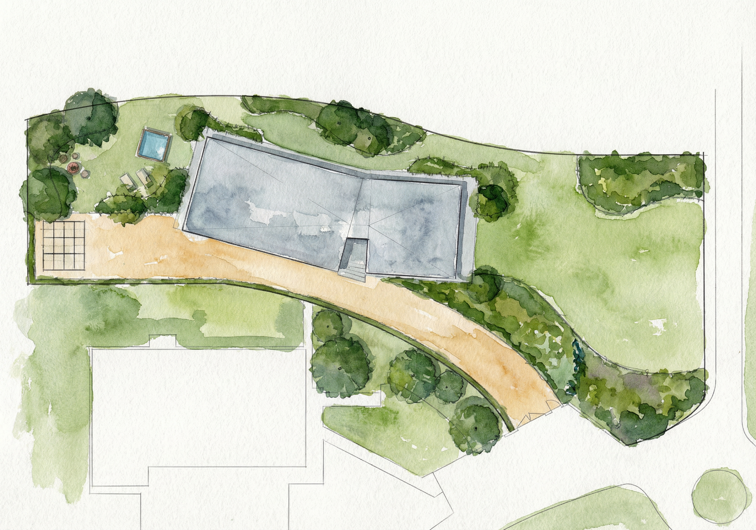 Il progetto mostrato in planimetria racconta bene cosa significa progettazione giardini su misura. Il giardino è stato pensato come uno spazio fluido, capace di accompagnare chi lo vive in un percorso naturale tra aree di rappresentanza e zone più intime.