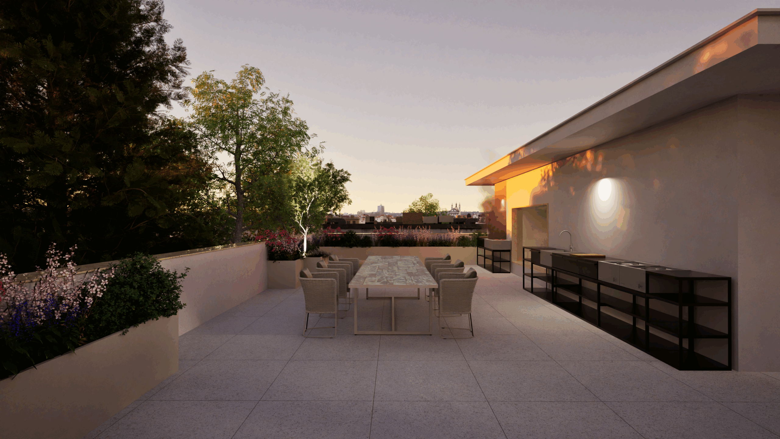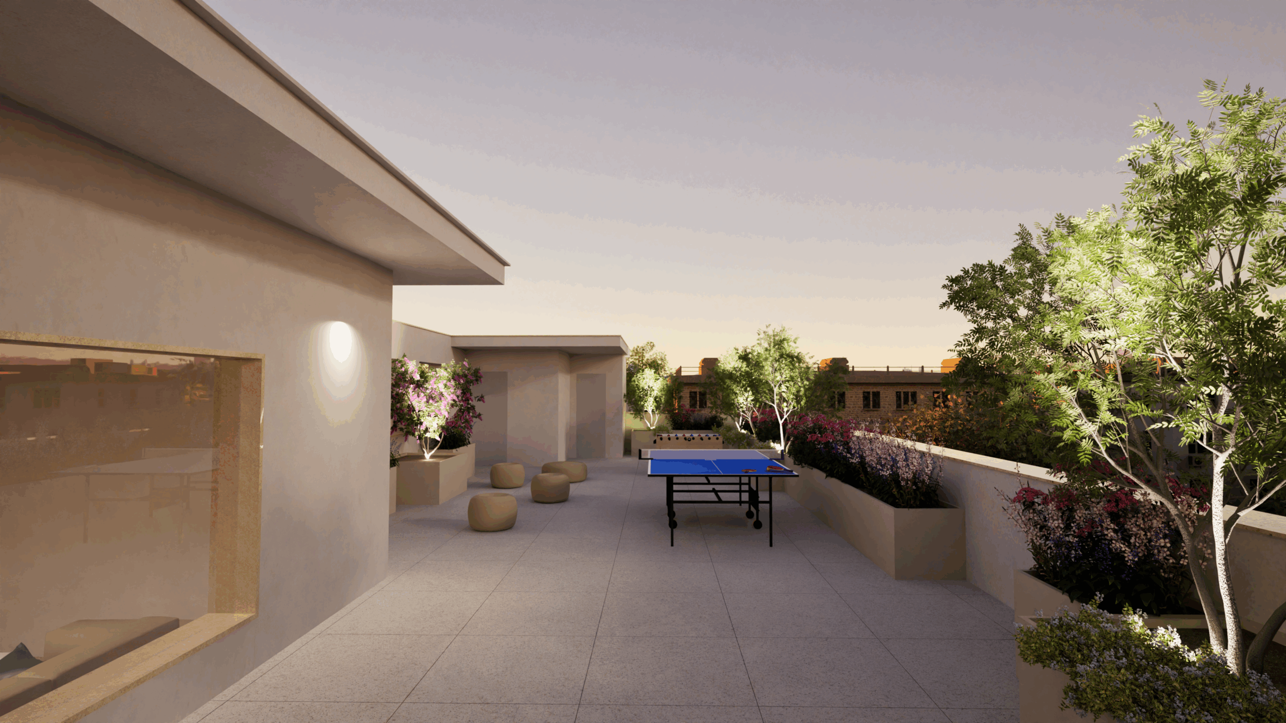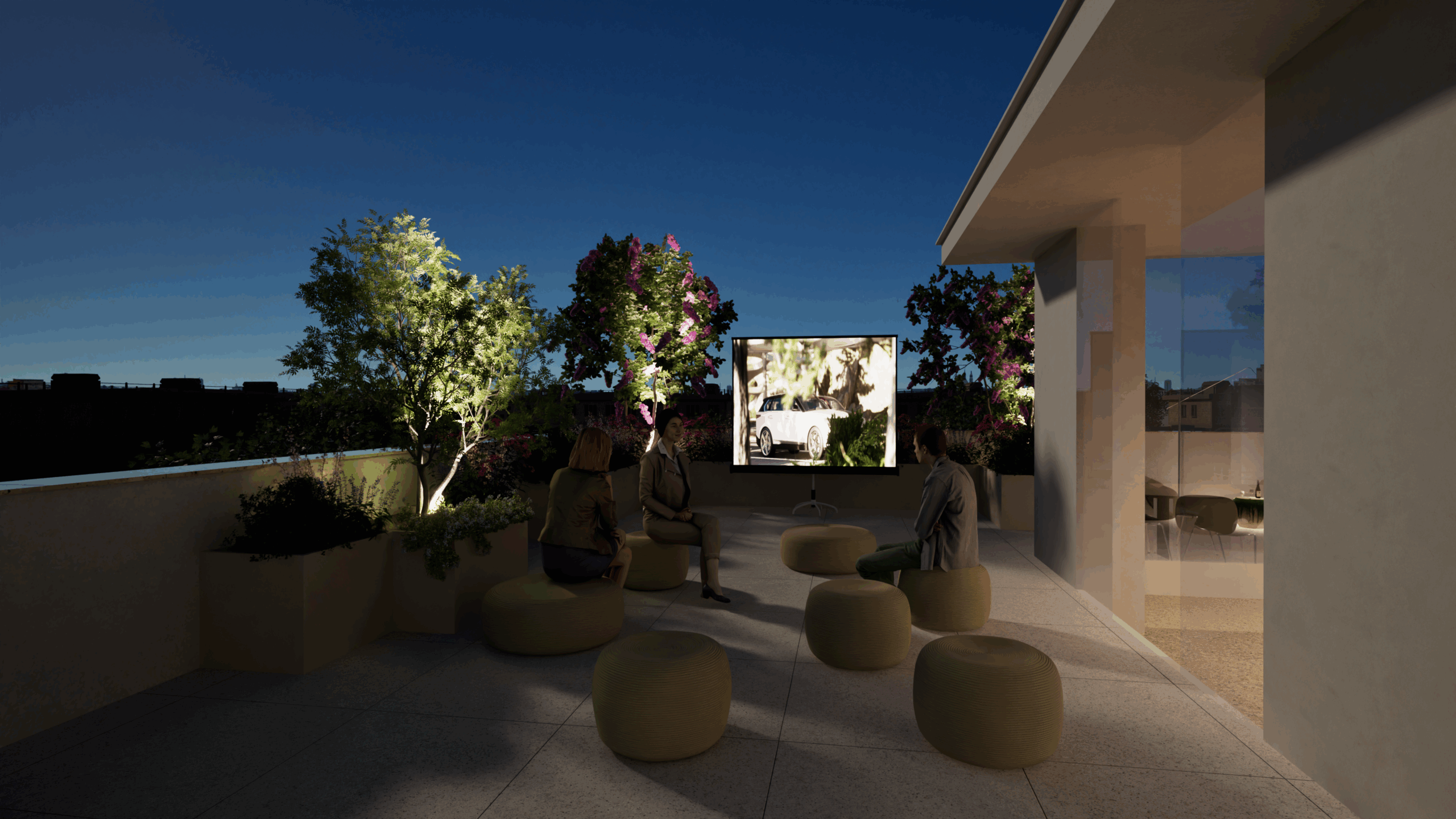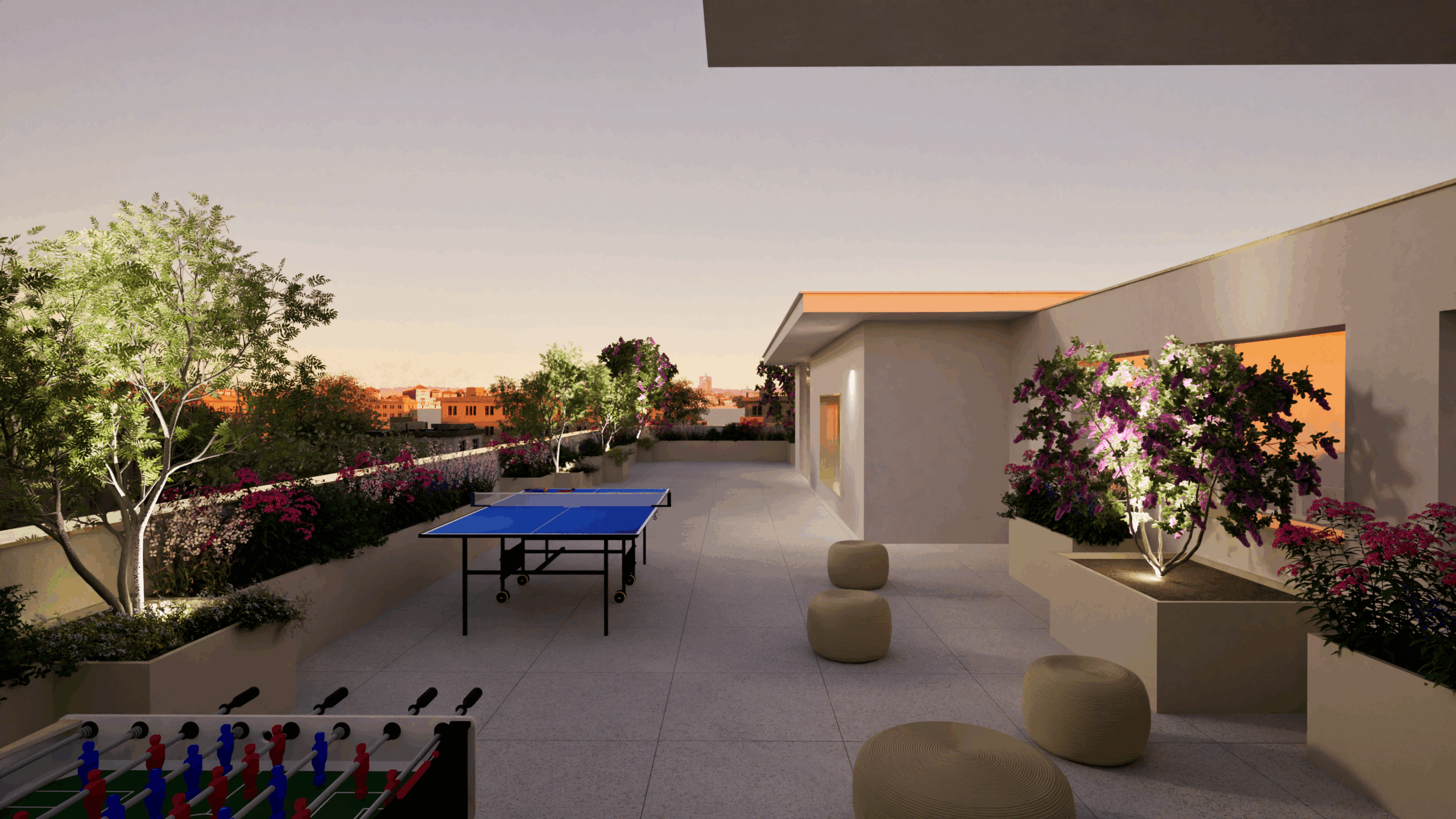 Per offrire la massima versatilità d’uso, la terrazza è stata suddivisa in spazi dedicati. In particolare, è stato creato un angolo lounge per momenti conviviali o per rilassarsi al tramonto. Accanto a questo, un angolo interattivo accoglie attività all’aperto, gioco o lavoro informale. Infine, l’angolo relax è pensato per la lettura, il benessere o semplicemente per godere della vista sulla città.
