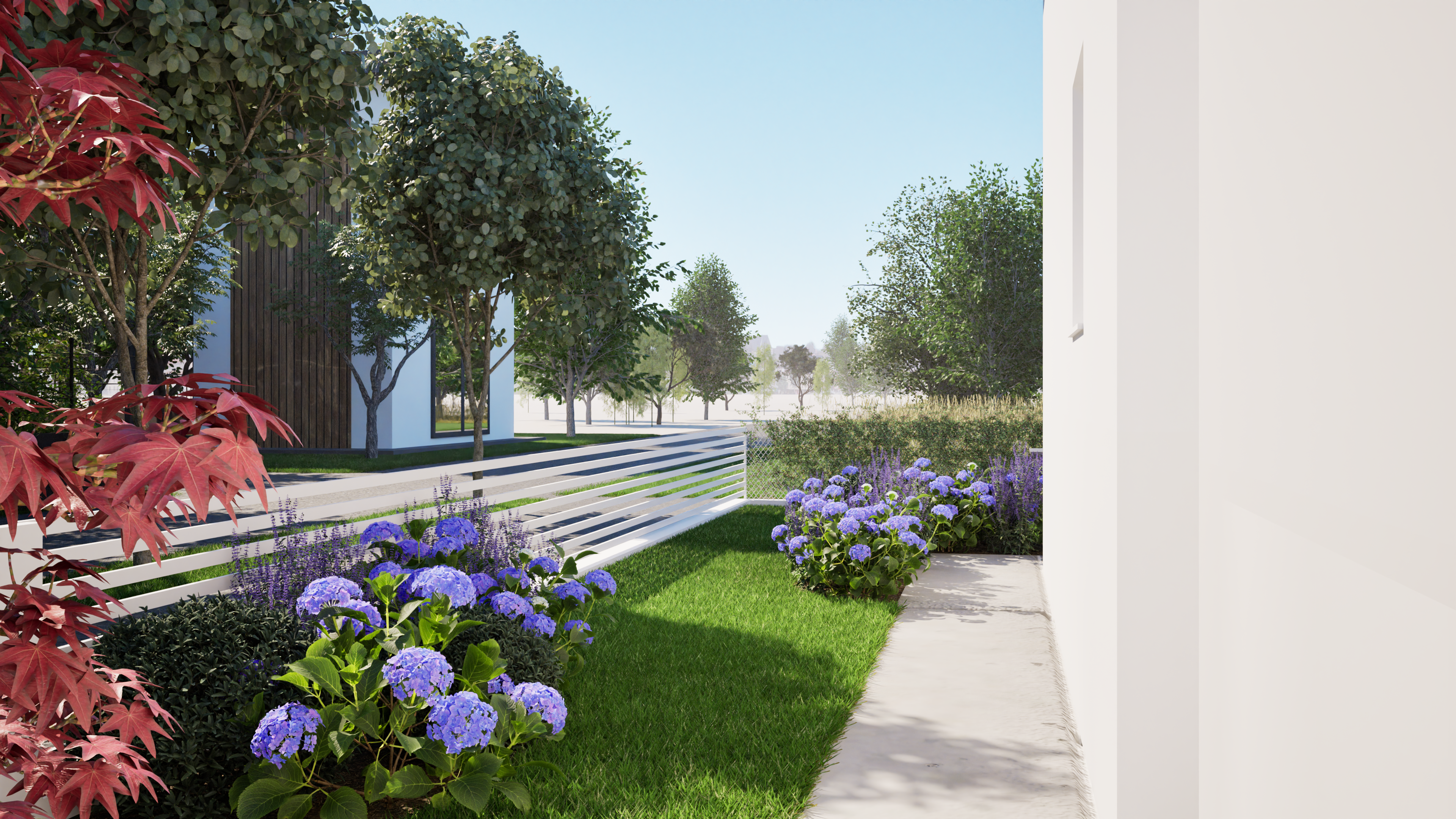 Il mix di fioriture stagionali e piante sempreverdi conferisce al giardino una bellezza senza fine. Le alberature sono in grado di alternare fioriture primaverili con colorazioni calde e vivaci durante l’autunno. Le eleganti sfere di Taxus sono state scelte per dare una struttura ben definita anche nei mesi più freddi, conferendo ordine e forma. Le piante perenni, abbinate alle ortensie, donano un’esplosione di colori che abbellisce il giardino in ogni stagione.