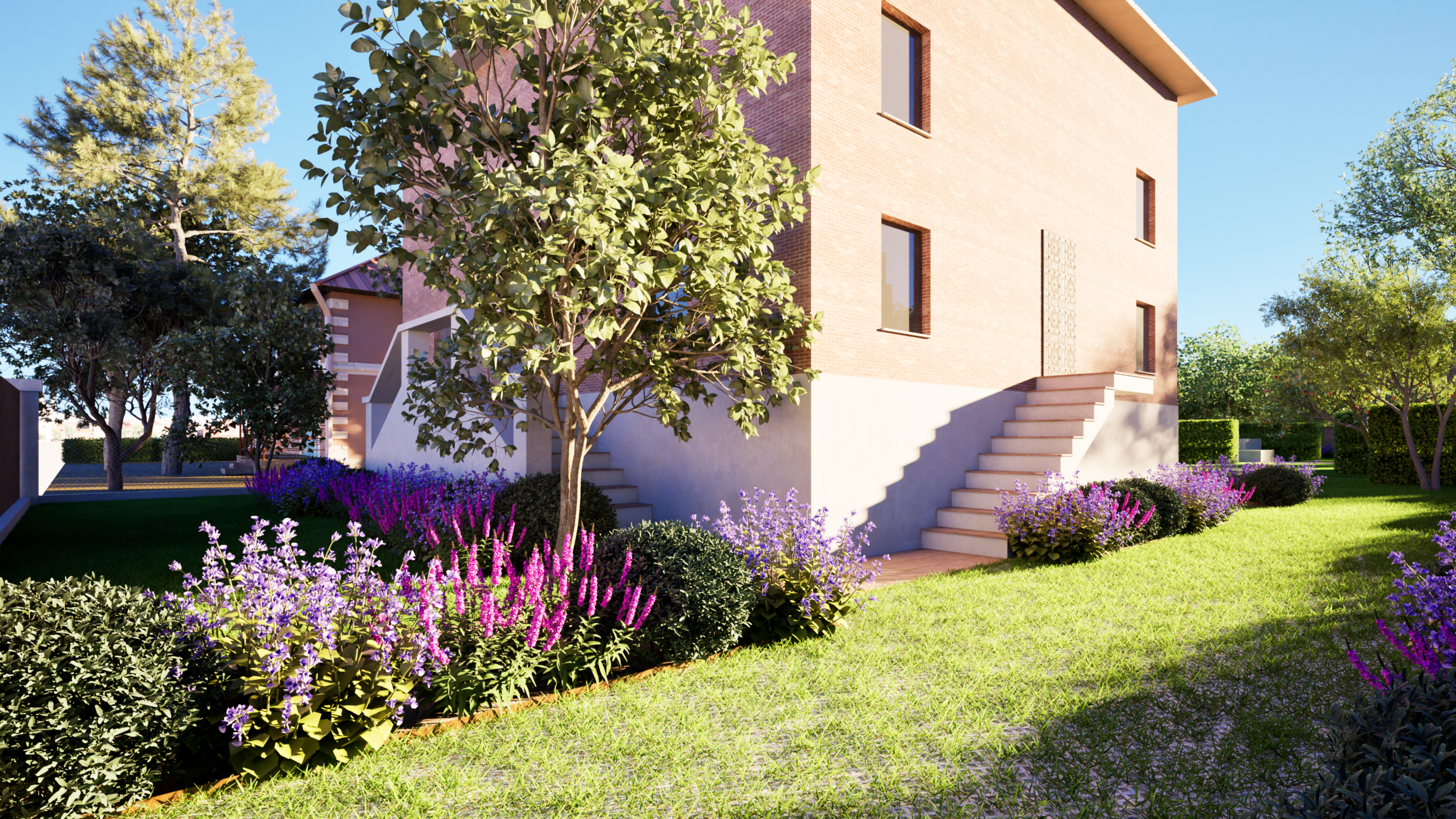 Particolare attenzione è stata dedicata alla valorizzazione della visuale verso il muro in faccia a vista, che da semplice elemento di confine si trasforma in un punto focale della progettazione, dialogando con il verde e contribuendo a definire il carattere del luogo.